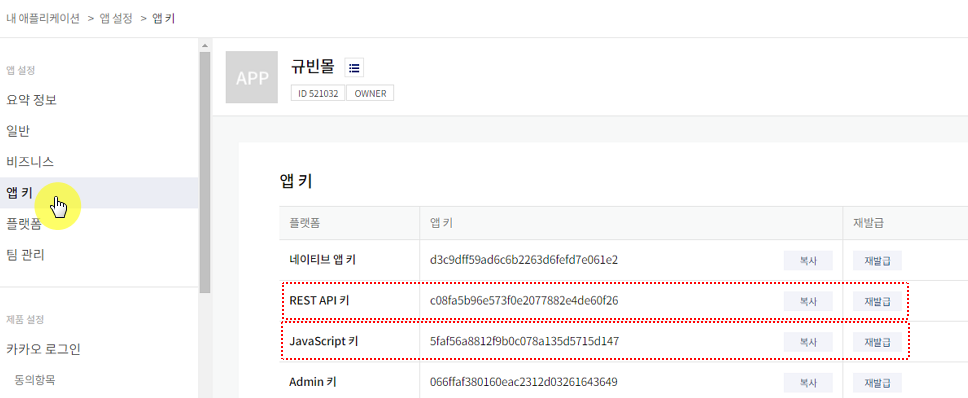 ์ ํ๋ฆฌ์ผ์ด์ > ์ฑ ์ ๋ณด > Rest API Key / JavaScript Key ๋ฅผ ํ์ธํด์.